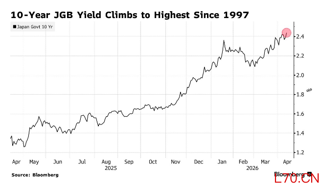 随着特朗普宣布美国将对战略要地霍尔木兹海峡实施全面海上封锁,中东紧张局势进一步升级,日本10年期国债收益率随之攀升至1997年以来的最高水平。