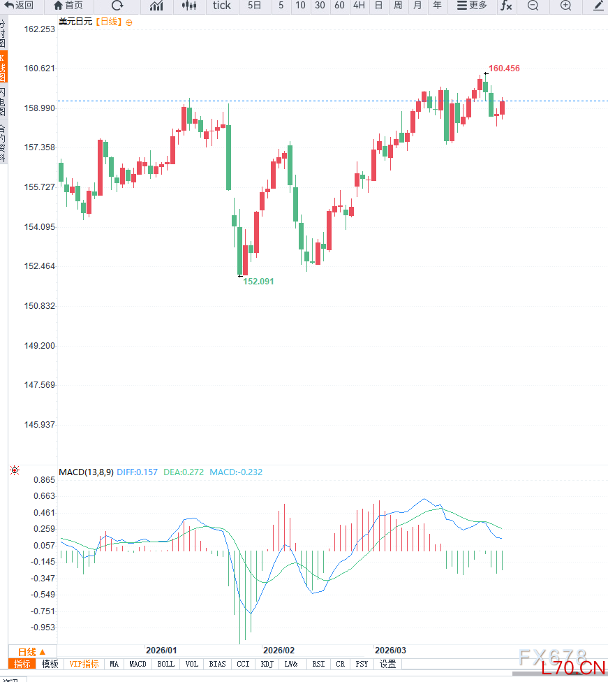 元股证券:ygzq.hk在此背景下,美元作为全球主要避险资产获得支撑,推动美元兑日元持续上行。与此同时,中东局势的不确定性仍在发酵,使市场资金继续偏向安全资产配置,进一步强化美元优势。然而,日元方面的潜在支撑因素也不容忽视。日本财务省官员近期明确表示,若市场出现过度投机行为,日本方面可能采取“果断措施”稳定汇率。这一表态被市场解读为潜在干预信号,尤其是在汇价接近160关口这一关键心理位置时,干预风险显著上升。从宏观角度看,当前美元兑日元的上涨逻辑主要来自美元端驱动,即避险需求与利率预期的叠加,而日元则因超宽松政策长期承压。但随着汇率逼近关键区间,日本当局的政策干预预期正在逐步增强,对汇价形成上行约束。从技术面来看,美元兑日元日线级别维持明显上升趋势,价格持续运行在均线系统上方,多头结构稳固。当前上方初步阻力位于159.50,进一步阻力关注160.00及161.20区域,其中160关口为重要心理与政策干预敏感区域。下方支撑位位于158.20,若回调跌破,则可能测试157.50及156.80区域。从动能来看,日线MACD仍维持多头发散,但高位动能开始趋缓,需警惕阶段性调整。