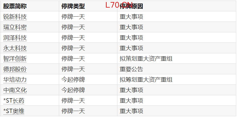 A股停牌提示:10股今日停牌