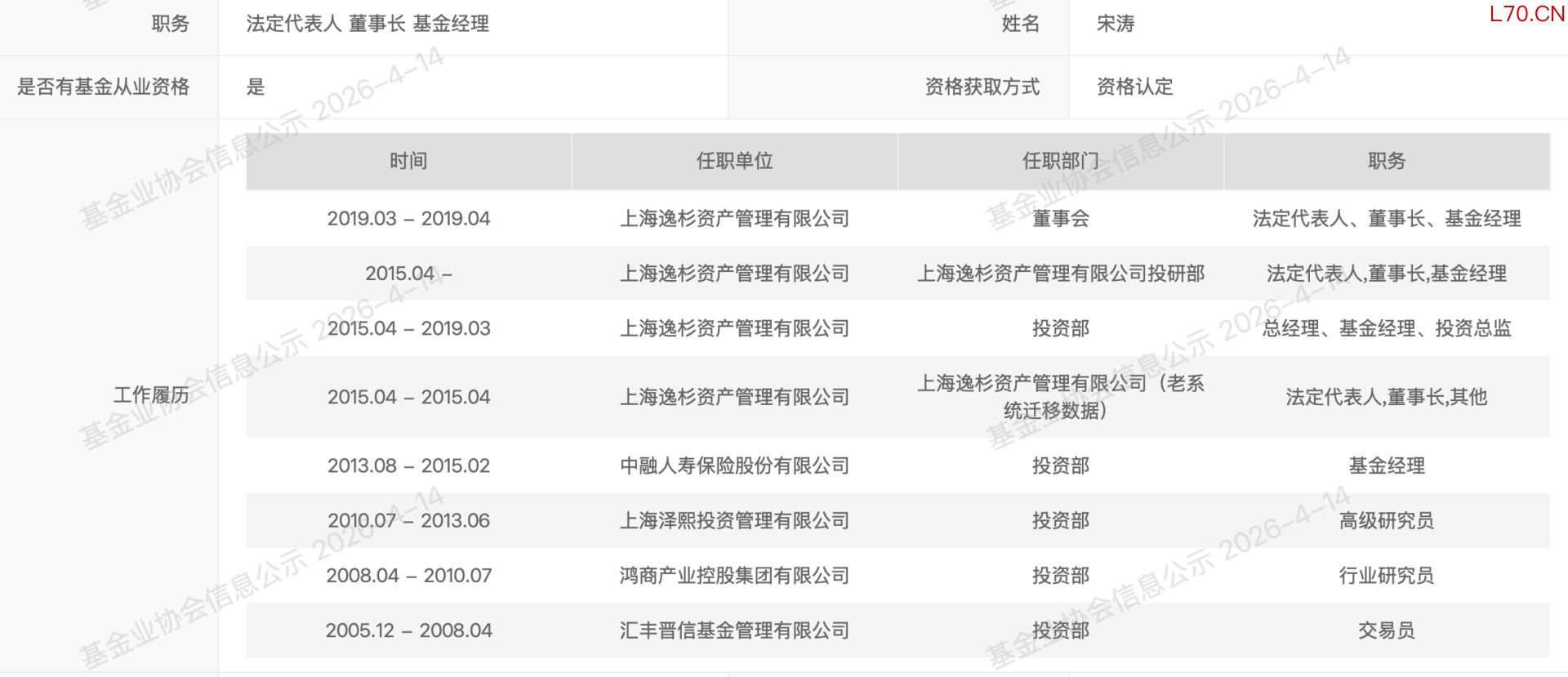 根据中基协备案资料,宋涛曾任职汇丰晋信基金、中融人寿,还曾在徐翔旗下的泽熙投资担任过三年的高级研究员。2015年4月,宋涛创办逸杉资产并担任法定代表人、董事长,公司为登记备案的私募基金管理人,注册资本1000万元。