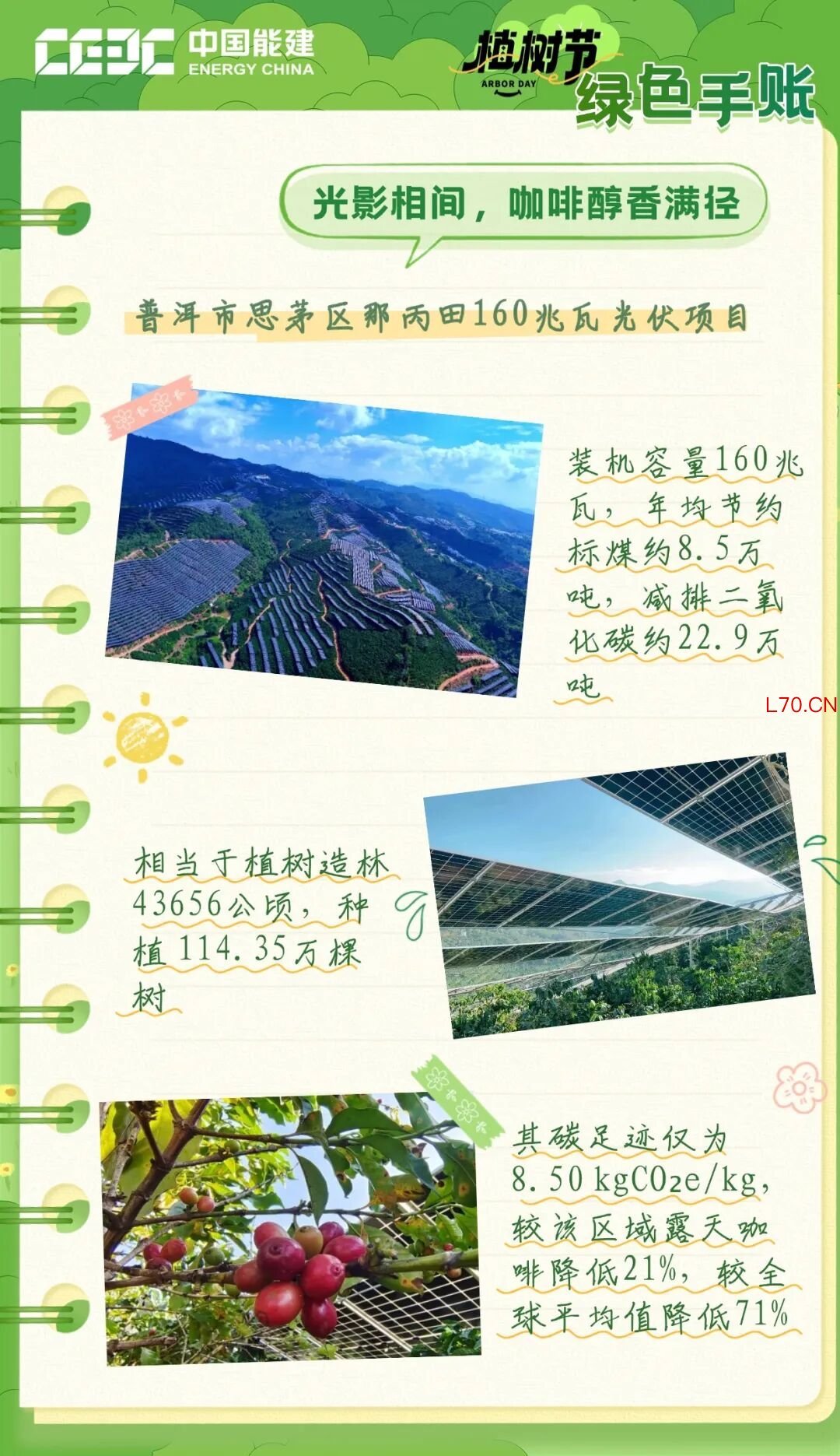 中国能建中电工程投资、云南院参股投资并EPC总承包建设的云南省普洱市思茅区那丙田光伏发电项目是中国首个“咖光互补”项目。项目利用咖啡喜温润不酷暑天气的特性,采用大间距、高支架,因地制宜采用柔性支架技术,保障咖啡生长需要的光照和雨水,减少对农作物生长的影响。如今,板下咖啡单株产量提高,果肉中的可溶性糖与咖啡因比例趋于平衡,经专家杯品检测,可达到云南一级豆的标准。光伏板下种植的咖啡豆成为村民收入的一大来源,实现了生态咖啡与能源产业的深度融合。