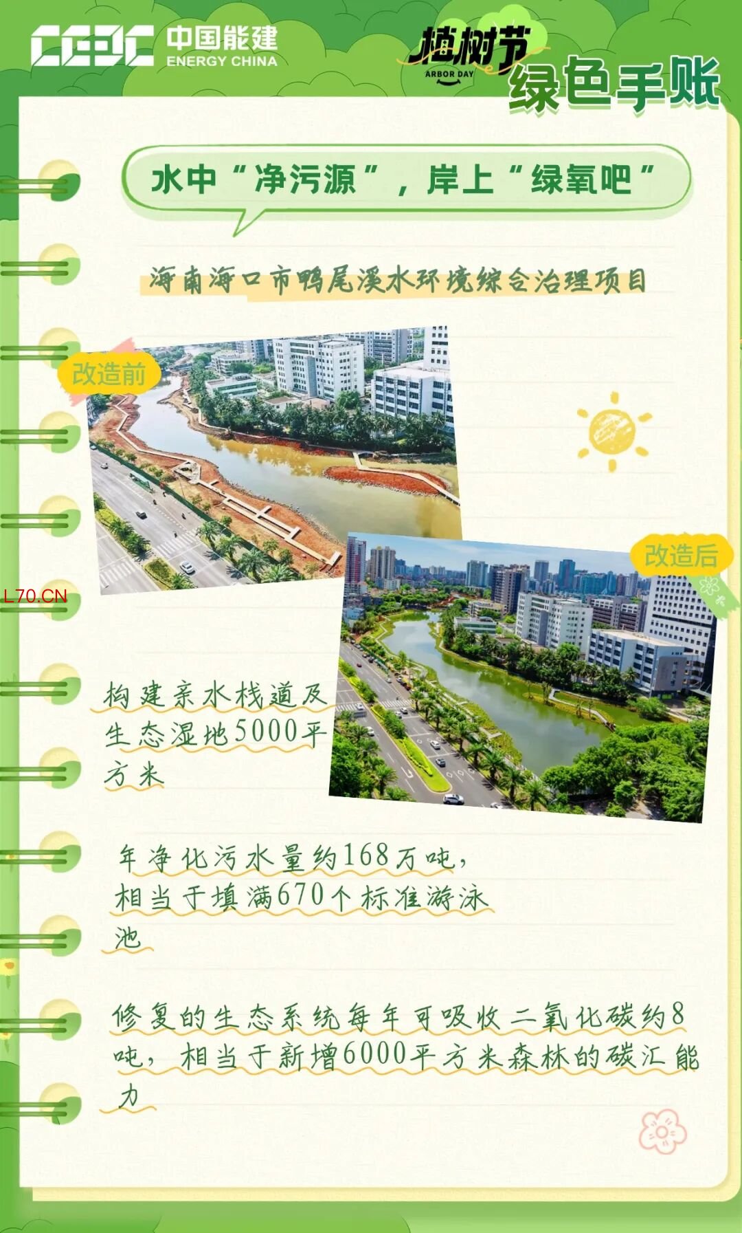 在海南海口市鸭尾溪水环境综合治理项目,中国能建构建截污控源、内源治理、活水补水、生态修复、景观提升的完整治水体系。一体化净水站日均处理4600立方米生活污水,相当于每天净化约1.8个标准游泳池的水量;1.1千米生态岸线与5000平方米湿地红树林,不仅让水质稳定达到V类标准,更每年削减265吨化学需氧量和50吨氨氮污染物。