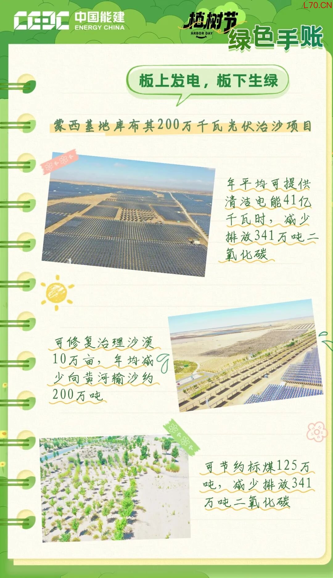 中国能建江苏电建一公司承建的蒙西基地库布其200万千瓦光伏治沙项目,充分利用光伏板间与板下的可利用土地,种植优质牧草、灌木等植被。在场区外围沙漠区域,利用杨树与花棒、羊柴混交播种的方式,规划建设碳汇林(防风林带),并在碳汇林区域,采用飞播草籽的方式,提高植被覆盖率,防沙固沙,增强固沙效果,打造“光伏+优质牧草+碳汇林”示范区。
