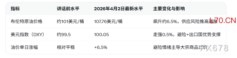 特朗普近期针对伊朗问题的最新言论进一步加剧了不确定性。他在讲话中强调军事行动将“极其猛烈”推进,明确指出若无协议将对伊朗发电设施等关键目标实施重击,这与前一日相对温和的撤军预期形成鲜明对比。市场迅速解读为冲突持续时间可能超出此前乐观判断,导致避险资金加速流入美元资产,同时原油期货因中东供应中断风险再度上修。从结构性角度看,美元获得双重有力支撑:一是其传统避险地位在高地缘风险环境下被显著放大;二是美国作为石油净出口国的优势使高油价环境下美元相对其他主要货币更具韧性。最新数据显示,布伦特原油价格已飙升至107.76美元/桶,较前一日大涨约6.5%,WTI原油同期也突破106美元/桶关口。这一油价涨幅直接反映了投资者对能源通道安全担忧的加剧,同时强化了美元的吸引力。美元在这一背景下维持强势,最新美元指数(DXY)升至100.05附近,较讲话前低点回升约0.5%。高油价推升全球通胀预期,进一步削弱市场对美联储快速宽松的押注,实际收益率上升也间接利好美元定价。