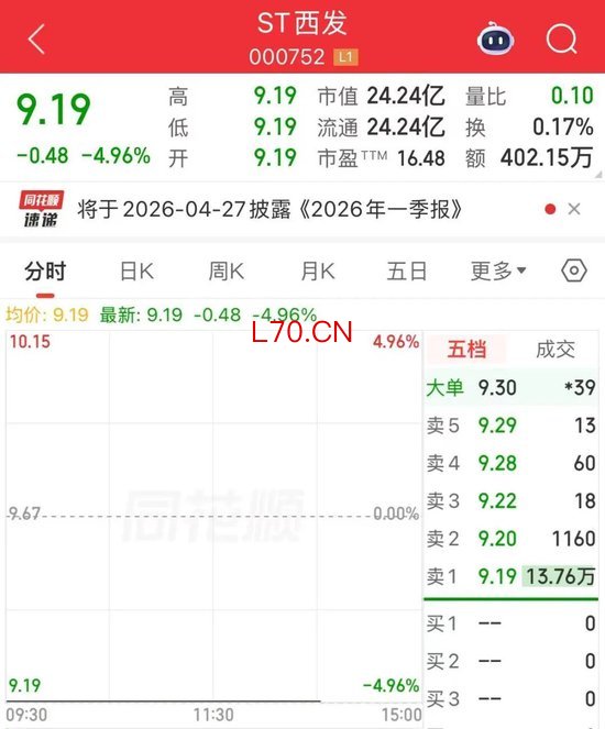 4月3日,ST西发开盘跌停,报9.19元/股。截至发稿,ST西发仍保持一字跌停状态。