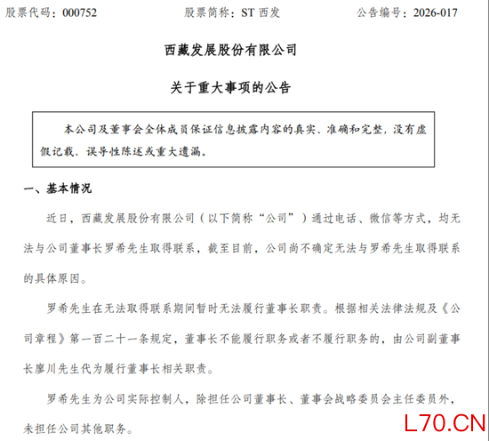 ST西发表示,罗希在无法取得联系期间,暂时无法履行董事长职责。根据相关法律法规及《公司章程》规定,董事长不能履行职务或者不履行职务的,由公司副董事长廖川代为履行董事长相关职责。